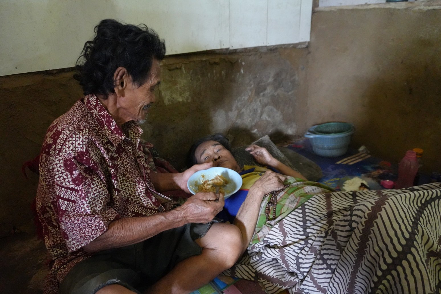 Hari itu, kami melihat keduanya hanya makan dengan lauk seadanya yakni bubur pagi sisaan dari istrinya. Itu pun hanya banyak buburnya daripada ayamnya. Sungguh miris terkadang mereka juga selama ini bergantung dari pemberian dan belas kasih tetangganya.