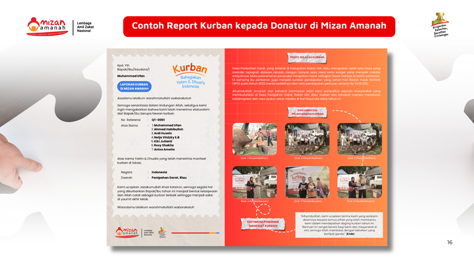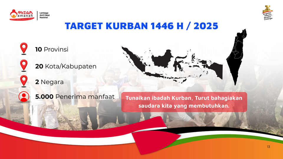 Berkurban dengan nyaman hanya di Mizan Amanah penyembelihan sesuai syari’at, pendistribusian tepat manfa’at dan dapat di rasakan oleh kaum dhuafa, anak-anak yatim dan mereka yang membutuhkan (Mustahik).
